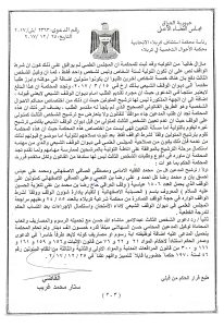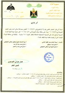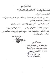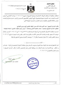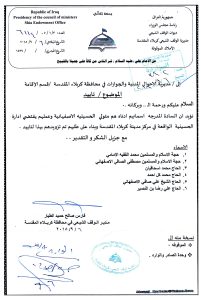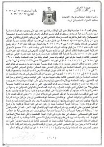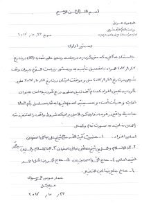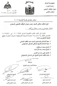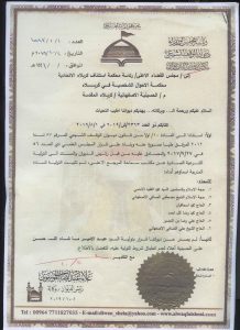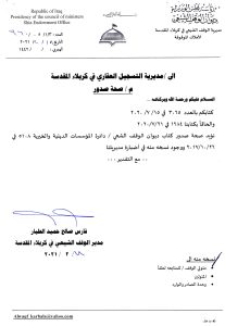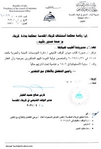 - نامۀ دیوان وقف شیعی به دادگاه عراق و تأیید آیت الله صافی برای تولیت و ردّ صلاحیت عبدالأمیر ماشاءالله و اینکه شرایط تولیت بر او منطبق نیست