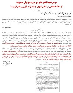 - در پی شبهه افکنی های در مورد متولیان حسینیه آیت الله العظمی سیستانی فتوای جدیدی به قرار زیر صادر فرمودند