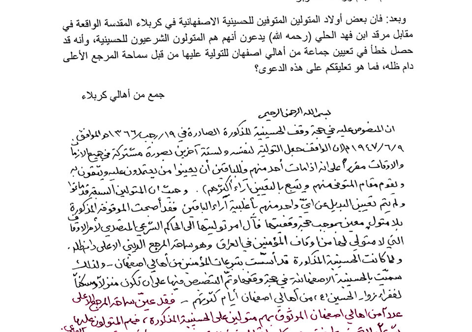 برخی از اولاد متولیان فوت شدۀ حسینیه اصفهانی ها در کربلای معلا مقابل مرقد ابن فهد حلی، مدعی هستند که ما متولی شرعی حسینیه مذکورهستیم و در تعیین جمعی از اهالی اصفهان به عنوان متولی حسینه اشتباهی از جانب مرجعیت اعلی رخ داده است. نظر شما در مورد این ادعا چیست؟